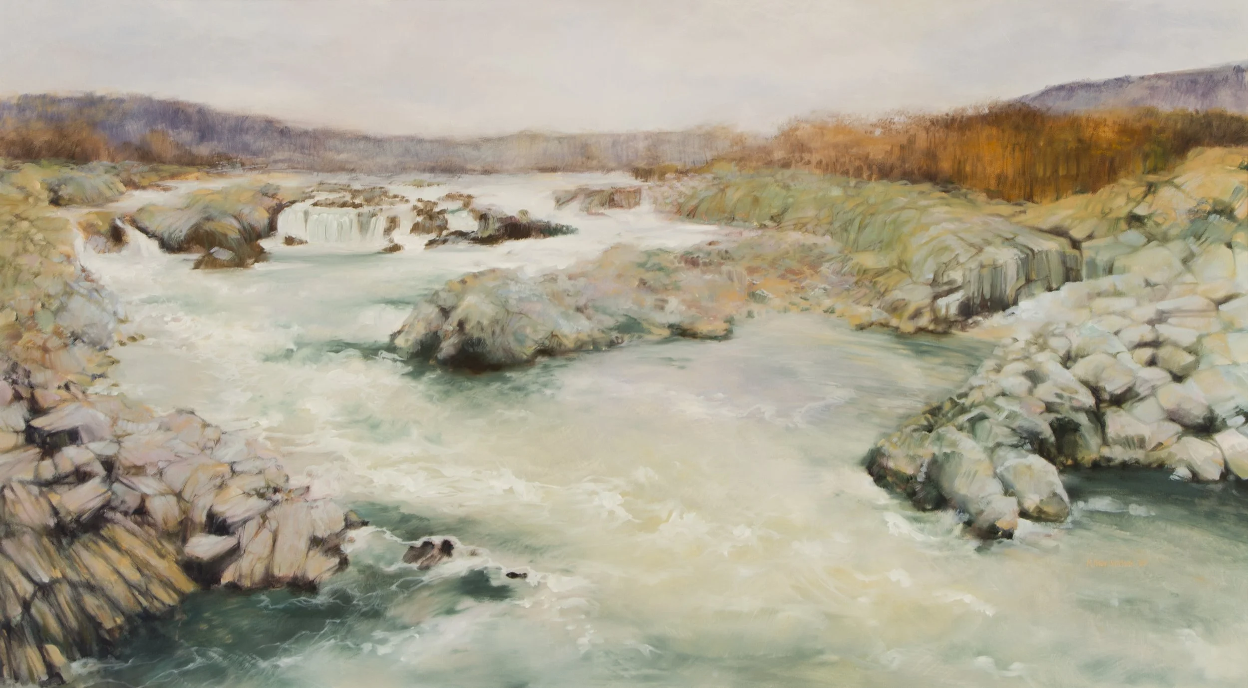 From Marikay Peter Witlock: “My love for wild places, water, mountains and woods began with a move to Maryland in 1978. Living 2 hours from the Appalachians and 2 hours from the Chesapeake Bay was incredible for a girl from the flatlands of Illinois. Years of hiking and backpacking in Maryland, Virginia, West Virginia and Pennsylvania connected me to the land in ways nothing else had. Three large scale paintings Potomac Overlook Summer, Autumn and Winter were my love letters of farewell to the region when I moved back to Illinois in the late 1980’s. The Potomac Overlook views the Potomac River at one of its wildest places near Great Falls, Virginia. This spot is along “Billy Goat Trail”, apply named for its rocky challenge to hikers. Rafters and kayakers find great challenge here, or give it up all together and carry their vessels along the rocky shore. The Overlook in Winter is particularly introspective and captured my mood of lament for leaving the Region. Painting the place in 3 seasons was the beginning of my career long interest in series paintings that repeat the same scene in different moods, seasons, and lighting.