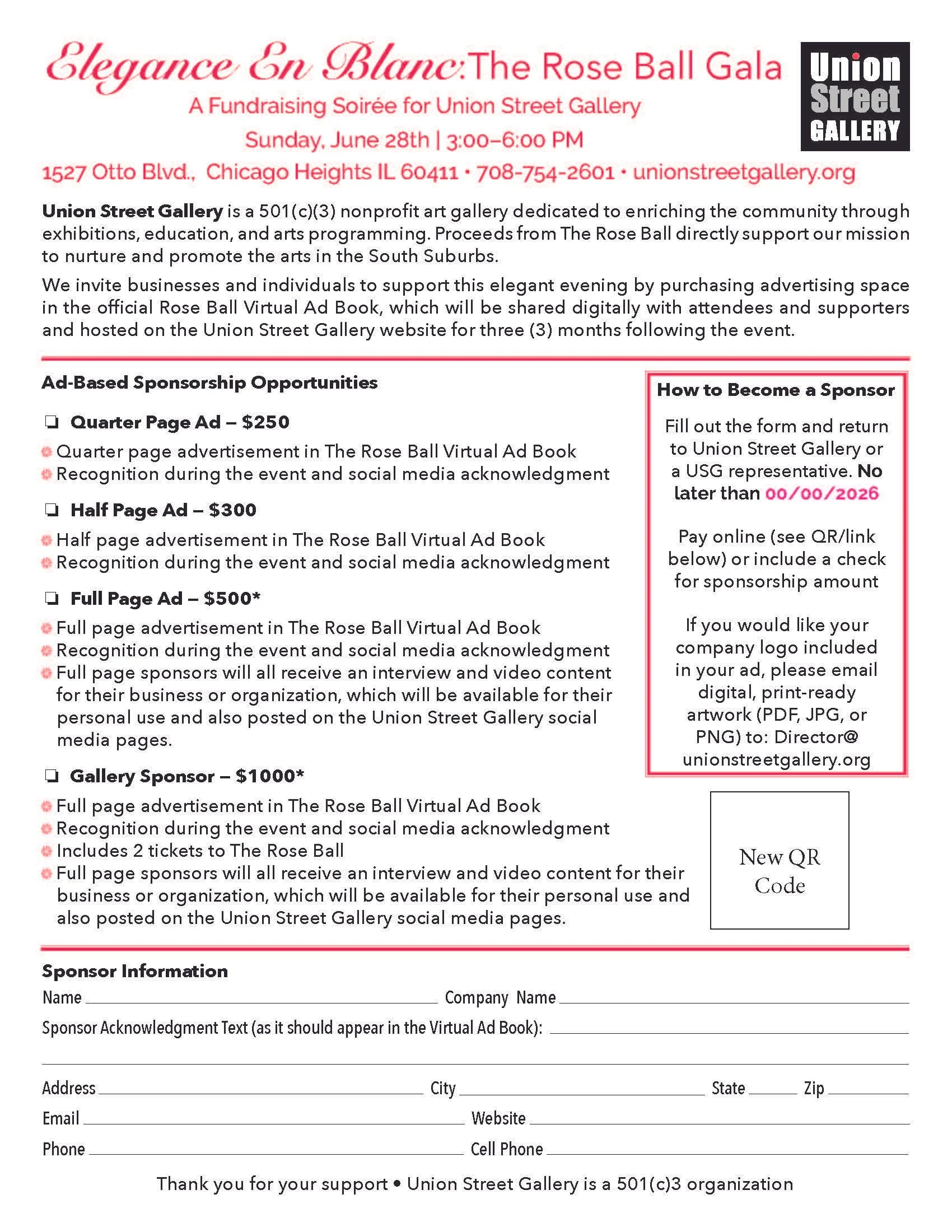 Union Street Gallery is currently seeking sponsors for Elegance En Blanc: The Rose Ball Gala. Sponsors will receive recognition during the event, with select tiers including expanded promotional opportunities.